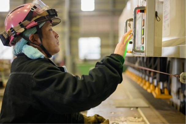 現場職のやりがいは、道工具や各種設備、クレーンなどを使いながら、切断・溶接・組立といった幅広い作業を実際に経験できることです。毎日同じ作業の繰り返しではなく、工程や製品に合わせてやることが変わるので、できることが増えていく実感があります。さらに、仕事に必要な資格や免許を会社負担で取得できるのも大きな魅力。学んだ分だけ現場で活かせて、自分の成長がそのまま仕事の幅につながります。