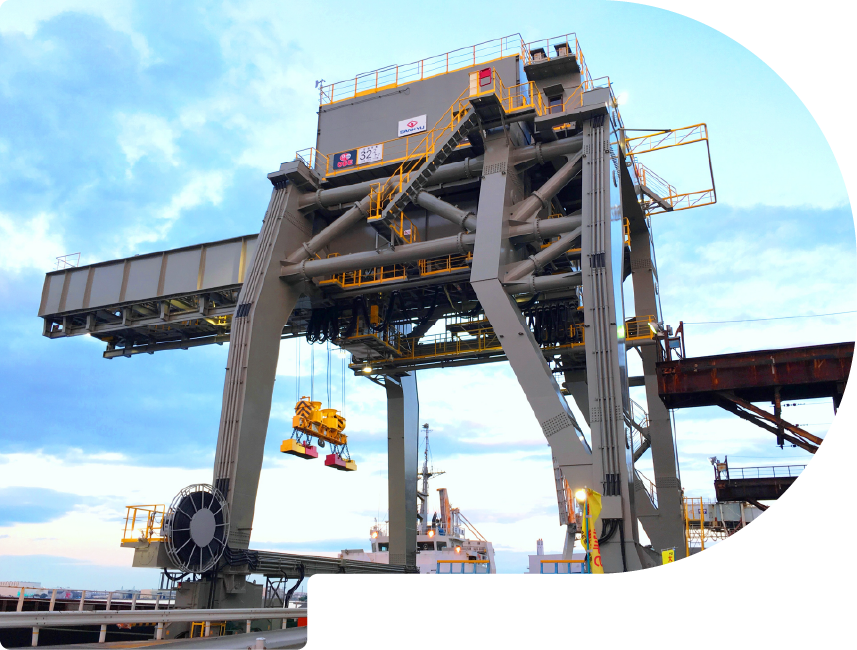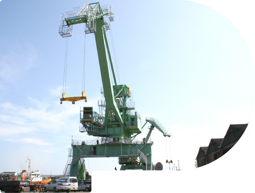 主に港湾の岸壁やふ頭、荷さばきヤードで使用されています。コンテナターミナルはもちろん、鋼材・木材の荷役拠点、セメントや穀物などのバルク貨物を扱う現場まで活躍の場は幅広く、港の物流を支える最前線で稼働しています。荷物の種類や作業内容が変わっても柔軟に対応できるため、「止まらない港」をつくる重要な役割を担っています。
