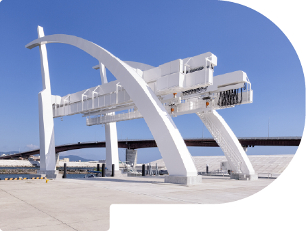 主に造船所で使用され、船体ブロックや大型部材の組立・搬送など、造船工程の要となる作業を担います。さらに発電所などの大型設備を扱う現場でも活躍します。また、重量物を製造している工場の出荷岸壁では、完成品を船積みするための荷役設備として使われることも。大きく重いものを「安全に、確実に」動かす必要がある場所で稼働しています。