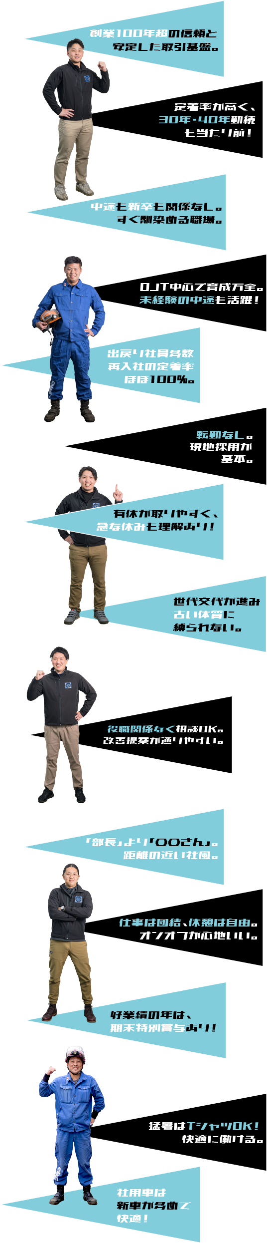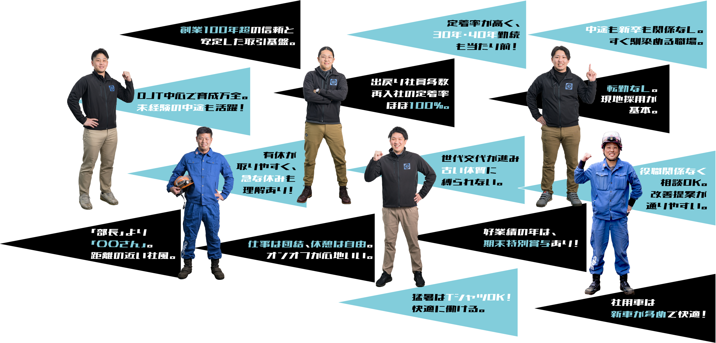 最初は覚えることが多くて大変だと思いますが、その分、できることが増えていく実感があります。分からないことは周りがしっかり教えてくれるので、焦らず一つずつ身につけていけば大丈夫です。現場仕事に興味がある方なら、チームで力を合わせて形にしていく面白さや、やり切ったときの達成感を感じられる職場だと思います。ぜひ一緒に挑戦しましょう。